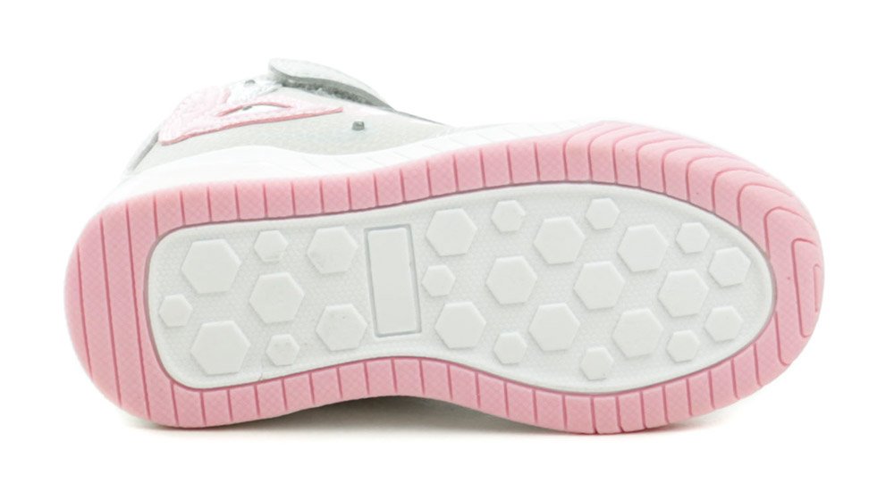 Dětská zimní kotníčková obuv se zalepováním na suchý zip, vyrobená ze syntetického materiálu. Podešev a strana obuvi při chůzi bliká.