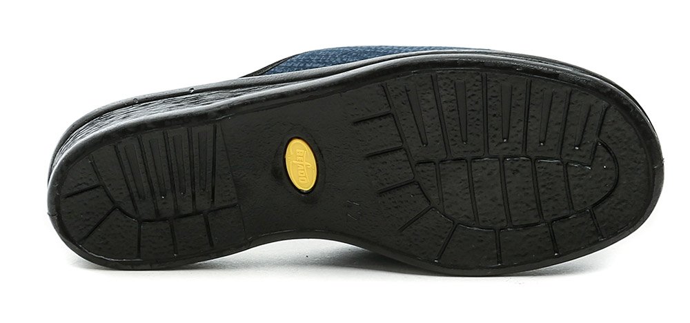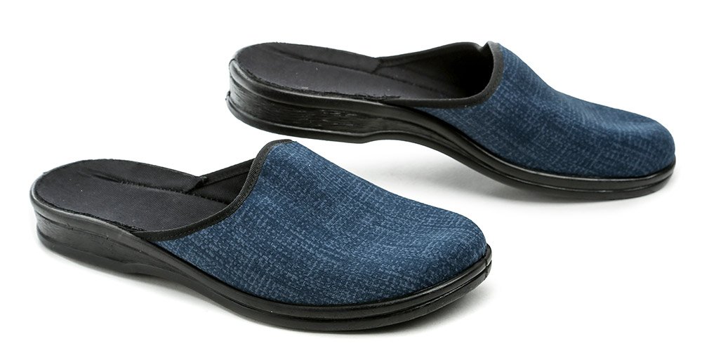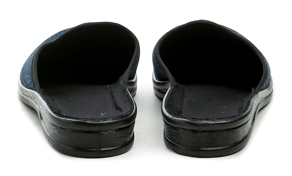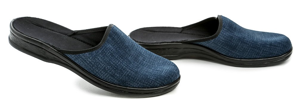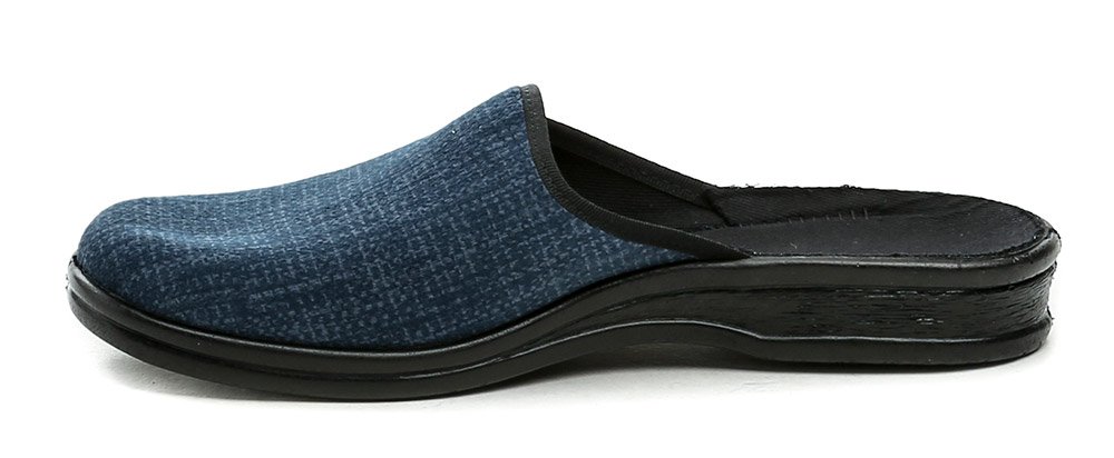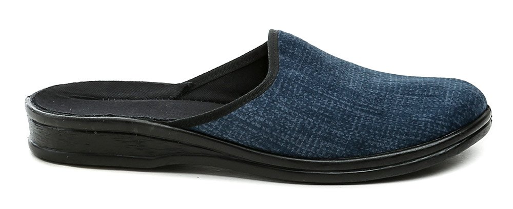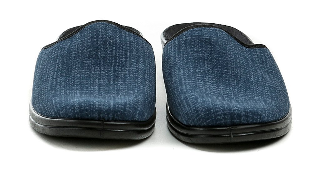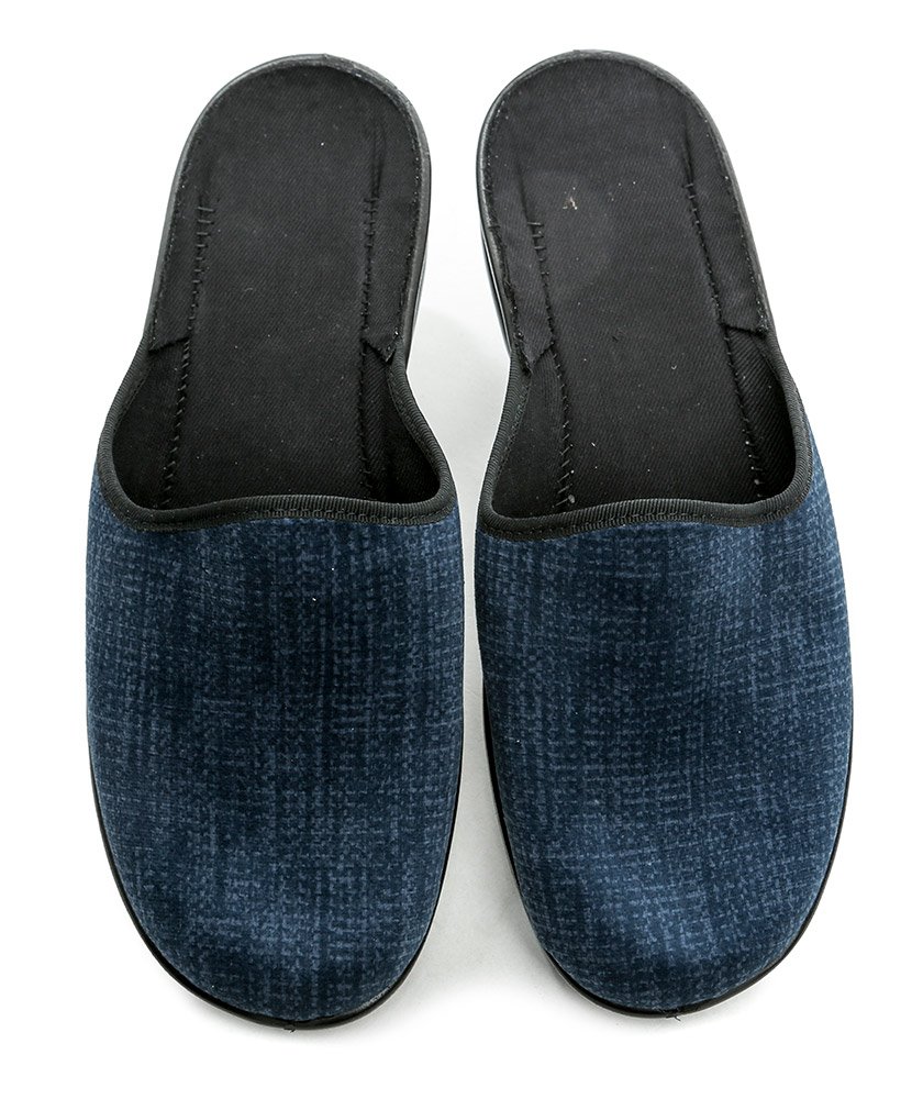 Pánská celoroční domácí přezůvková nazouvací obuv s plnou špicí, vyrobená z textilního materiálu.