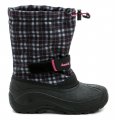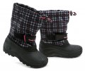 Dětská zimní vyteplená nepromokavá obuv s utahováním na gumovou tkanici se zdrhovadlem a se zapínáním na suchý zip kolem kotníku.