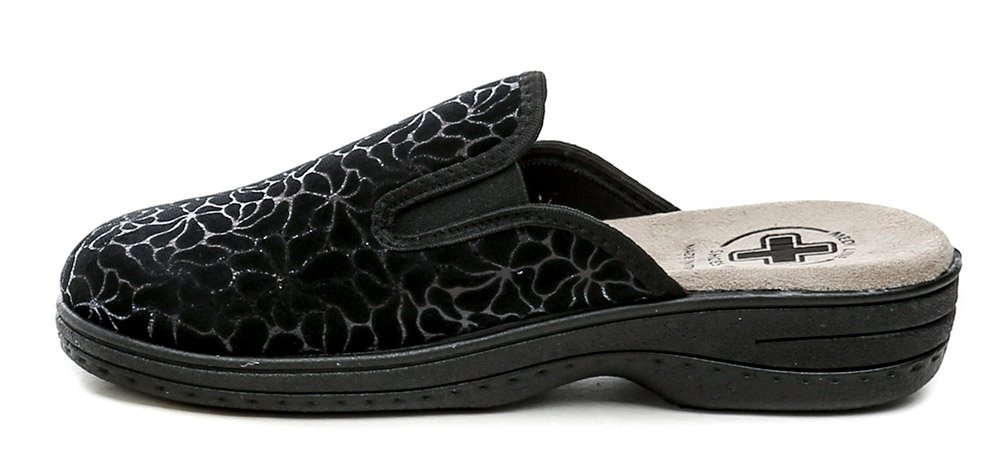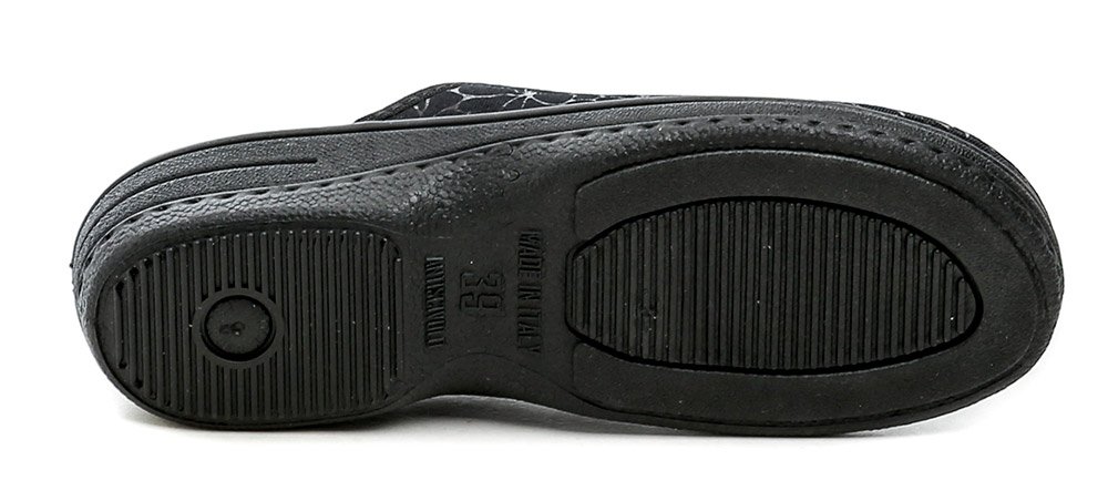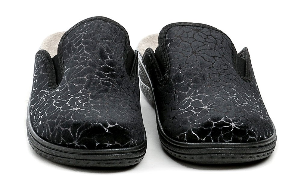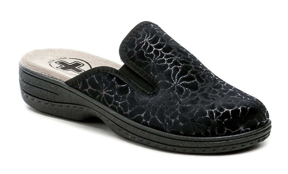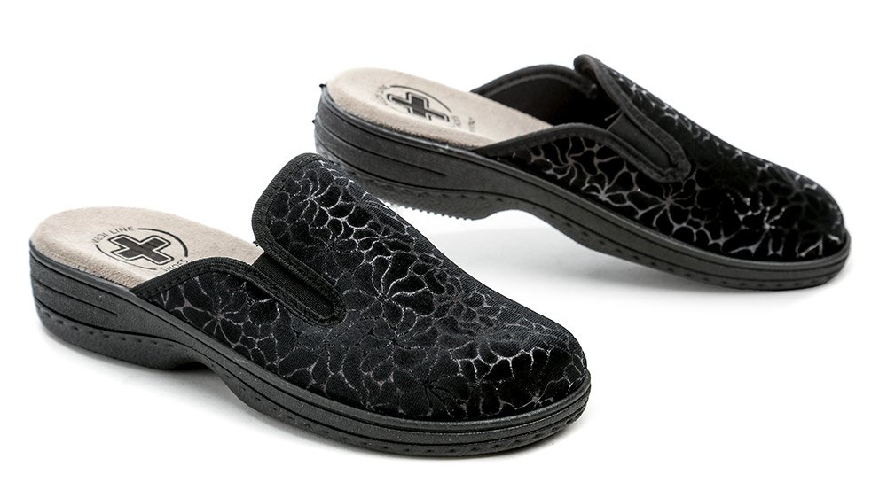 Dámská celoroční domácí zdravotní obuv na mírném klínku, vyrobená z pružného textilního materiálu vhodného pro chodidla s haluxy a stélkou z textilního materiálu.