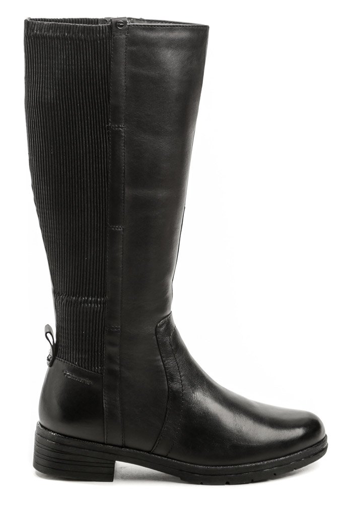 Zadní pružný dílec ze syntetické kůže umožňuje obout také pro širší lýtko.