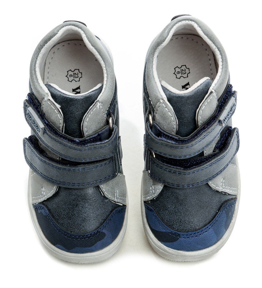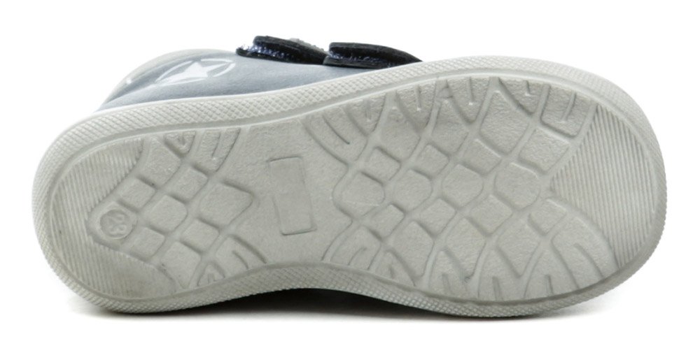 Dětská celoroční vycházková obuv se zapínáním na suchý zip, vyrobená ze syntetické kůže na svršku a uvnitř kompletně z přírodní kůže.